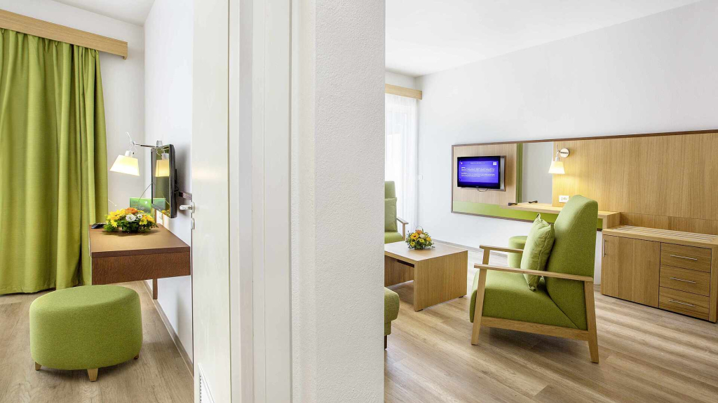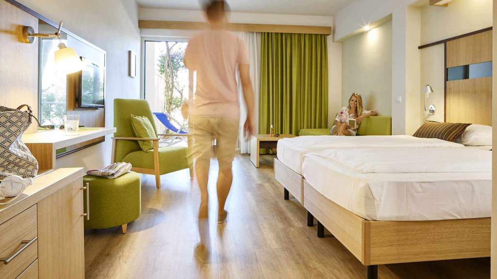 Sistemazioni: tutte le camere, NON fumatori, sono modernamente arredate dispongono di letto matrimoniale o letti singoli, frigorifero, TV, Telefono, Internet, aria condizionata autonoma, cassaforte, servizi con doccia ed asciugacapelli, balcone o terrazza e sono disponibili nelle seguenti tipologie: Camere Doppie Economy con capienza da 1 a 4 pax; Camere Classiche adatte ad ospitare 1-2 pax, Camere Superior con capienza da 1 a 3 pax; Camere Deluxe con capienza da 1 a 4 pax; Camere Familiari adatte per nuclei di 5 persone e Camere Familiari superior con porta comunicante sempre adatte ad ospitare al massimo 5 pax con bambini di eta più grande.